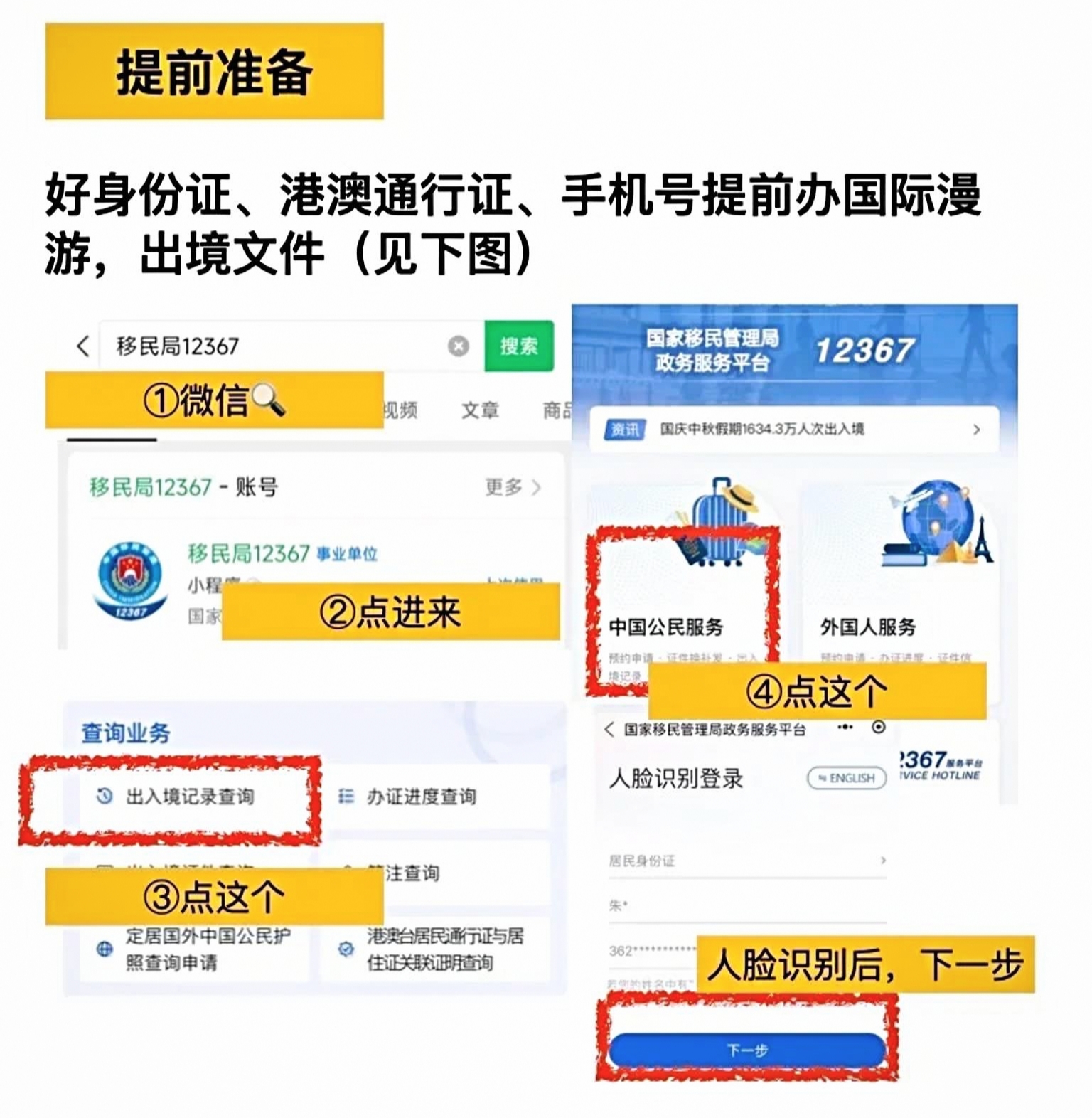 通过微信或支付宝小程序“移民局12367”下载的出入境记录PDF或长截图。